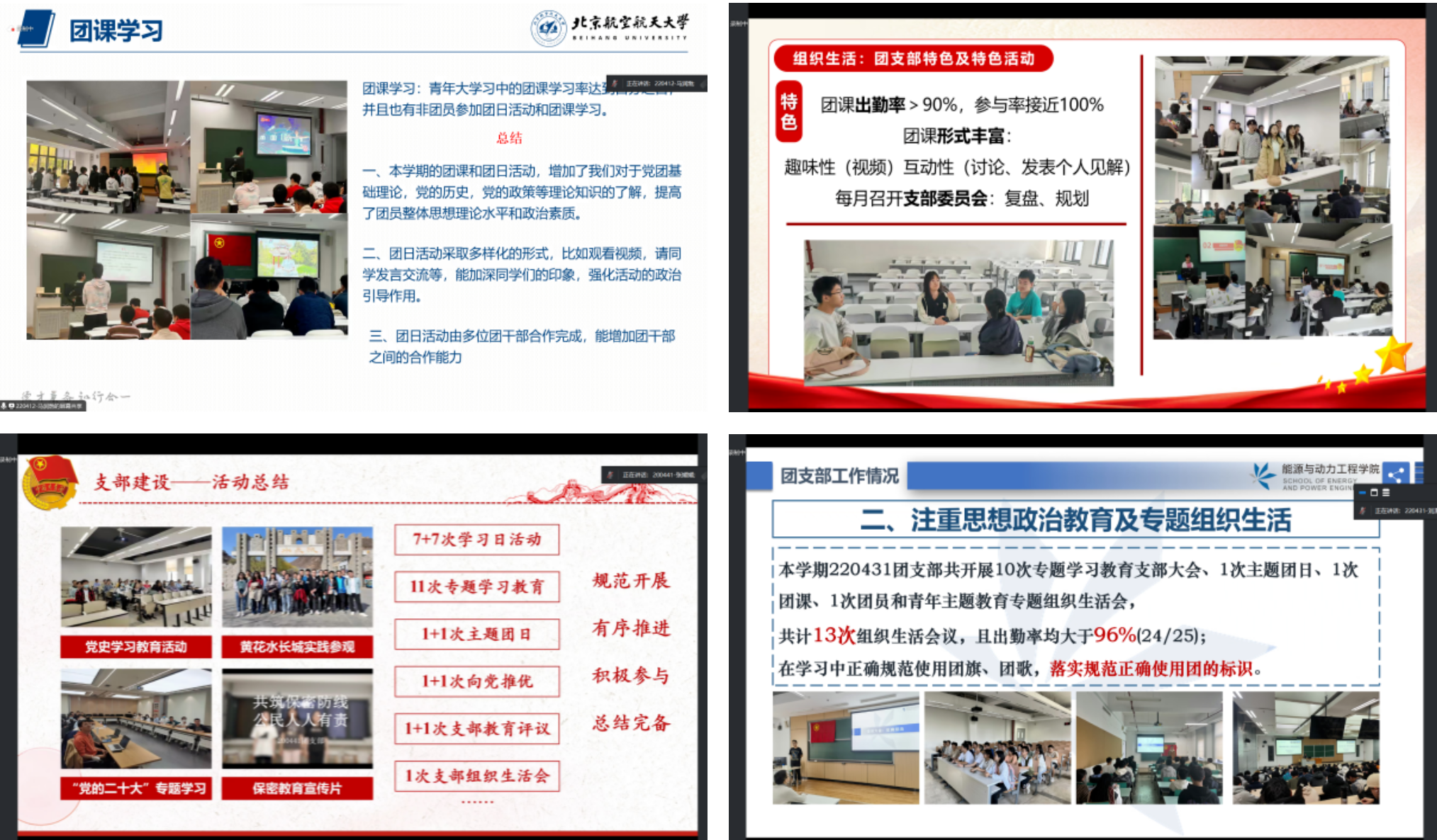各级团支部书记述职后,同级党组织和团员青年代表依次进行发言,对团支书在组织活动、团结团员、推动团组织工作等方面所取得的成果给予肯定,并针对目前工作中的不足提出建议。团员青年代表表示团结协作是提升团组织凝聚力和战斗力的重要途径,建议团支部书记加强团员间的交流与合作、提升团组织活动质量。各年级党支部书记建议所有团支部书记以优秀支部为榜样,注重工作细节、优化工作流程,引导支部规范化建设,提升组织的凝聚力。